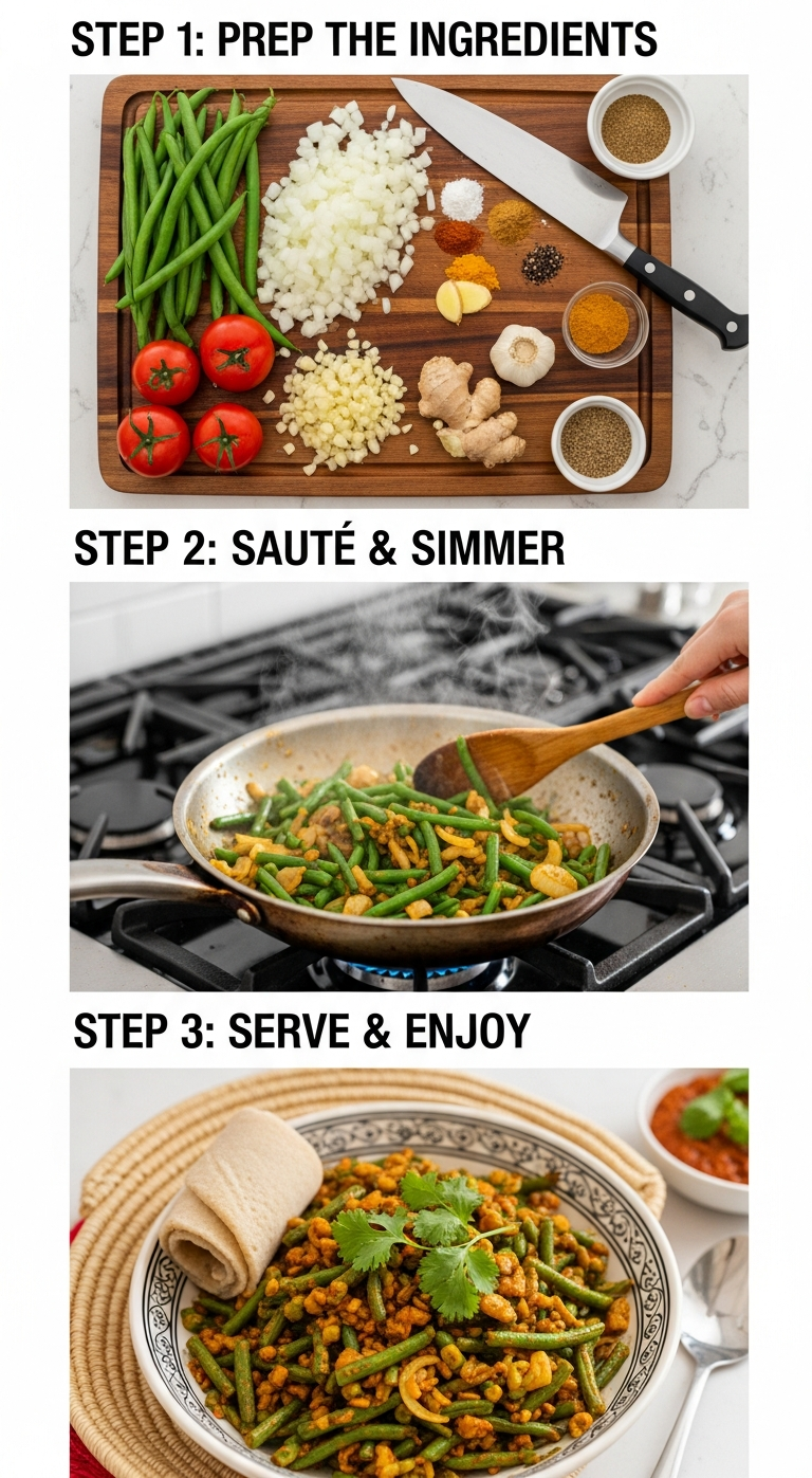 A7: To achieve the authentic feel, use fresh green beans trimmed and sliced evenly for uniform cooking. Sauté onions and garlic until fragrant before adding spices to unlock their full aromatic potential. Cook the beans quickly over medium-high heat to keep their crunch, and finish with a squeeze of lemon or a sprinkle of fresh herbs like cilantro for brightness.
