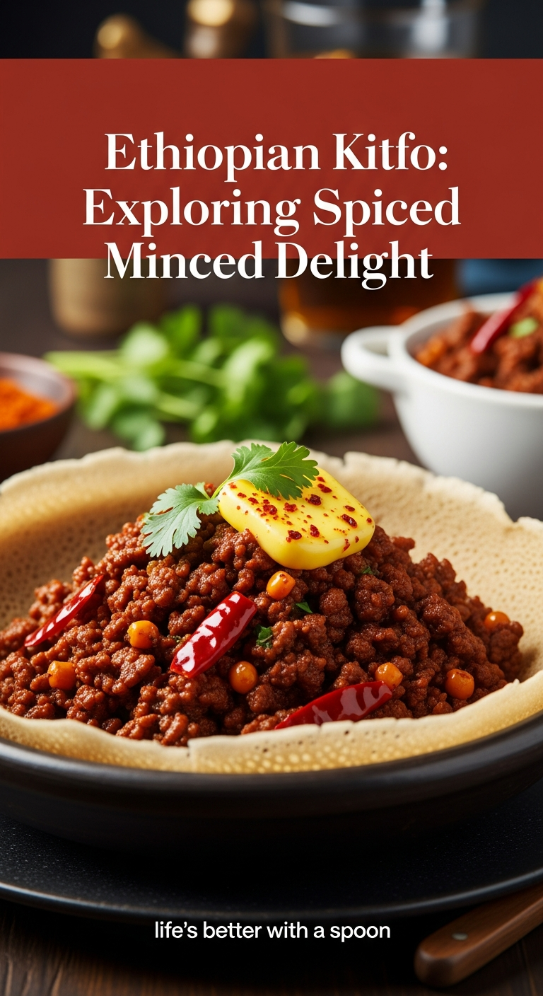 Showcasing the perfect harmony of textures and flavors, kitfo pairs exquisitely with injera-the traditional spongy Ethiopian flatbread made from fermented teff flour. Its slightly sour notes and soft texture offer a balancing canvas for the rich spiced beef. Complement your plate with side dishes such as ayib (ethiopian fresh cheese) to mellow the heat, and gomen (sautéed collard greens), which lend earthy freshness. Garnish generously with fresh eregga (Ethiopian chili peppers) or a squeeze of lemon for brightness. For a feast, serve with injera recipe from Bon Appetit to authentically embrace ethiopian culinary heritage.